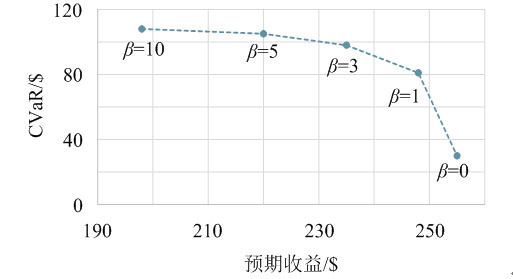 可以看出,隨著風(fēng)險偏好系數(shù)的增加,聯(lián)盟預(yù)期總收益逐漸較少,CVaR逐漸增加,且當(dāng)風(fēng)險偏好系數(shù)較小時,聯(lián)盟預(yù)期總收益隨CVaR的增加減少緩慢;但當(dāng)風(fēng)險偏好系數(shù)較大時,CVaR即使增加較小的數(shù)值仍會使聯(lián)盟預(yù)期總收益大幅下降。