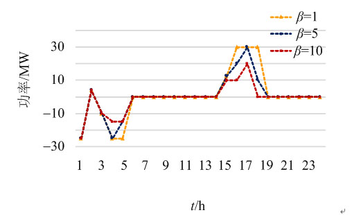 由圖可知隨著風(fēng)險偏好系數(shù)β的增加,抽蓄機(jī)組逐漸改變原有的利用電價差套利的最優(yōu)運(yùn)行狀態(tài),申報功率趨于保守,逐步變?yōu)楸M可能保持半蓄水狀態(tài)以最大限度的對可能的風(fēng)電實(shí)時出力不平衡進(jìn)行調(diào)節(jié),這一結(jié)果也再次說明本文所提競標(biāo)策略模型能夠很好的將第二階段可能的實(shí)時情況考慮在內(nèi)。