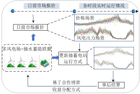 日前市場和實(shí)時平衡市場是電力現(xiàn)貨市場的主要組成部分[4],其中日前市場是主要的功率交易平臺,實(shí)時平衡市場旨在根據(jù)最新的負(fù)荷和電源變化對日前交易計(jì)劃進(jìn)行適量調(diào)整。風(fēng)電商根據(jù)其次日出力預(yù)測,參與日前市場競爭是主要的獲益方式。由于風(fēng)電邊際成本低,為了避免棄風(fēng),風(fēng)電商可以報零價以確保中標(biāo)。風(fēng)電商日前中標(biāo)的電量在實(shí)時運(yùn)行時由于其出力的不確定性(日前預(yù)測誤差),在實(shí)時平衡市場中會面臨不平衡懲罰。因此,尋求降低實(shí)時出力不確定性的運(yùn)行模式是風(fēng)電商參與現(xiàn)貨市場的關(guān)鍵。風(fēng)電商減少實(shí)時不平衡主要有兩種途徑,一是盡可能提升自身出力預(yù)測精度,減少實(shí)時出力偏差;二是聯(lián)合儲能等具有靈活調(diào)節(jié)能力的市場主體協(xié)同降低實(shí)時出力與日前值的偏差。針對途徑一有研究指出風(fēng)電場的集群效應(yīng)可以顯著降低整體出力的不確定性和波動性[5],即多個風(fēng)電場聯(lián)合參與現(xiàn)貨市場,利用多風(fēng)場的時空互補(bǔ)平滑效應(yīng)減少整體出力預(yù)測誤差,聯(lián)合參與現(xiàn)貨市場。針對途徑二,儲能系統(tǒng)由于其靈活調(diào)節(jié)特性,與風(fēng)電場聯(lián)合不僅可以最大限度彌補(bǔ)風(fēng)電場的實(shí)時出力偏差,還可以將多余的電能存儲后套利出售,實(shí)現(xiàn)儲能商業(yè)價值最大化。這其中以技術(shù)相對成熟、成本較低且能實(shí)現(xiàn)大規(guī)模存儲的抽水蓄能電站與風(fēng)電的聯(lián)合最有代表性[6]??梢姸囡L(fēng)場、風(fēng)-儲構(gòu)建有效聯(lián)盟參與現(xiàn)貨市場運(yùn)行,不僅可以實(shí)現(xiàn)聯(lián)盟收益最大化,為風(fēng)電和儲能參與現(xiàn)貨市場提供有效解決方案;對整個市場運(yùn)營來講,也有利于減少系統(tǒng)平衡成本,提升系統(tǒng)消納新能源能力以及運(yùn)行經(jīng)濟(jì)性,為此,本文研究多風(fēng)場與抽水儲能聯(lián)合優(yōu)化運(yùn)營策略,具體包括確定聯(lián)盟參與日前市場的競標(biāo)策略,以及聯(lián)盟收益的合理分配方式。其中,制定聯(lián)盟日前競標(biāo)策略時如何充分考慮風(fēng)電實(shí)時出力不確定性及由此帶來的平衡成本及收益風(fēng)險是關(guān)鍵。