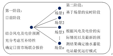 基于以上分析,多風(fēng)電與抽水蓄能電站聯(lián)合的日前市場優(yōu)化運(yùn)行策略需要解決兩個關(guān)鍵問題:一是如何充分利用各主體間的互補(bǔ)特性確定最優(yōu)的聯(lián)合競標(biāo)策略;二是如何描述風(fēng)電實(shí)時出力不確定性在實(shí)時平衡市場面臨的平衡風(fēng)險對聯(lián)盟運(yùn)行收益的影響。為此本文采取Look ahead的思想設(shè)計(jì)兩階段的隨機(jī)優(yōu)化模型,如圖2所示。第一階段針對日前市場考慮次日多風(fēng)電預(yù)測出力及其相關(guān)性,確定日前聯(lián)合優(yōu)化競標(biāo)策略。針對風(fēng)電實(shí)時出力不確定性,采用多場景描述,并且依據(jù)風(fēng)電及電價實(shí)時的可能情況確定抽水蓄能電站的最優(yōu)運(yùn)行模式,以最小化不平衡成本,這是第二階段的問題,并且將其嵌入日前優(yōu)化模型中。這個兩階段模型旨在日前制定聯(lián)盟優(yōu)化競標(biāo)策略時,充分展望實(shí)時運(yùn)行時可能出現(xiàn)的不確定性風(fēng)險,并且同時給出風(fēng)儲優(yōu)化運(yùn)行策略。