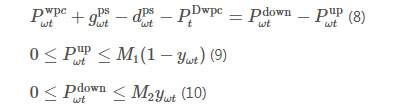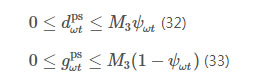 式中:ψωt是為了將互補(bǔ)性約束線性化引入的二進(jìn)制變量,表征抽蓄機(jī)組工作狀態(tài);M3為足夠大正數(shù)。