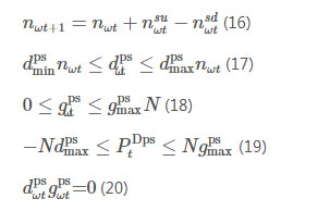式中:dps min、dps max、gps max分別表示抽蓄機(jī)組的抽水及發(fā)電的出力及限值;N、nωt分別為抽蓄電站中總機(jī)組數(shù)目及運(yùn)行在抽水狀態(tài)的機(jī)組數(shù)目,其中互補(bǔ)性約束(20)保證抽蓄機(jī)組同一時刻只能有一個工作狀態(tài)。