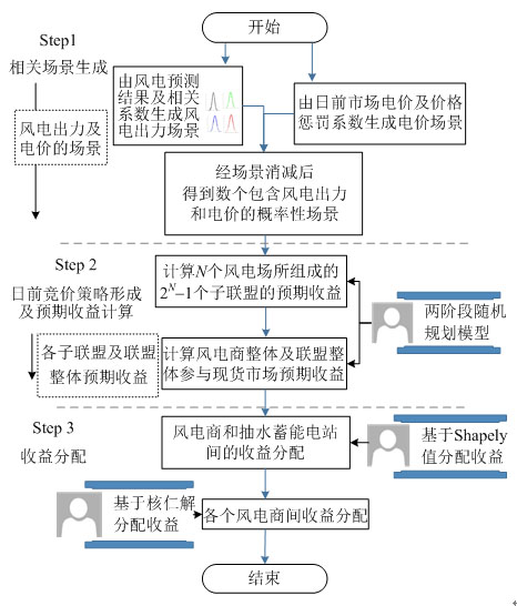 綜上,本文所提的多風(fēng)電及抽水蓄能電站日前優(yōu)化決策模型及對應(yīng)的收益分配方法計(jì)算流程如圖3所示,整體包括3步:場景生成、日前競標(biāo)策略形成及預(yù)期收益計(jì)算、收益分配。