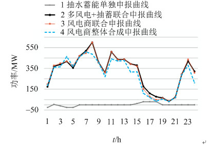 對比曲線2、3可見,抽水蓄能電站加入后,原有的風(fēng)電商聯(lián)盟在負(fù)荷高峰時段申報功率提高,而在負(fù)荷低谷時段申報功率降低,即聯(lián)盟將電價較低時的一部分電能轉(zhuǎn)移到高電價時期出售,也就是抽水蓄能電站的加入在一定程度改善了風(fēng)電商反調(diào)峰特性,進(jìn)而使聯(lián)盟在現(xiàn)貨市場獲得更多收益。
