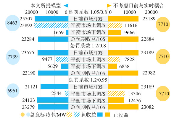為驗(yàn)證所提的聯(lián)合競標(biāo)模型能否有效將日前和平衡市場的耦合關(guān)系考慮在內(nèi),圖5給出了未考慮日前和平衡市場耦合關(guān)系、以及考慮耦合關(guān)系且在不同平衡市場價格懲罰系數(shù)下的競標(biāo)策略及其預(yù)期收益(其中日前收益和總預(yù)期收益數(shù)值相對較大,因此在圖中的單位為10$)。