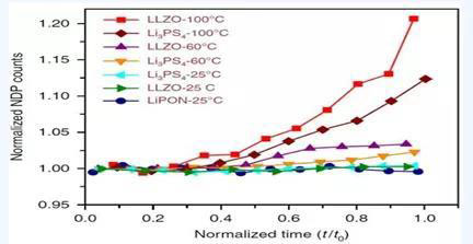 上圖很明顯可以看到,在整個鋰沉積過程中,LiPON-25℃的體相區(qū)域中的鋰含量保持恒定,LLZO和Li3PS4則在不同溫度下均有枝晶生成,溫度越高枝晶生長越多。