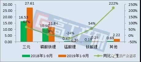 根據(jù)合格證數(shù)據(jù)口徑計(jì)算,2019年1-9月新能源汽車動(dòng)力電池裝機(jī)量42.31GWh,同比增長(zhǎng)47%。其中,三元?jiǎng)恿﹄姵匮b機(jī)量27.61GWh,同比增長(zhǎng)67%,占總裝機(jī)量的65.25%,較去年同期占比上升7.80%;磷酸鐵鋰動(dòng)力電池裝機(jī)量11.84GWh,同比增長(zhǎng)9%,占總裝機(jī)量的27.98%,較去年同期占比下降9.88%;錳酸鋰動(dòng)力電池裝機(jī)量0.36GWh,同比下降24%,占總裝機(jī)量的0.85%,較去年同期占比下降0.79%;鈦酸鋰動(dòng)力電池裝機(jī)量0.29GWh,同比增長(zhǎng)54%,占總裝機(jī)量的0.68%,較去年同期占比上升0.03%;其他未注明具體電池類型的鋰離子動(dòng)力電池裝機(jī)量2.22GWh。