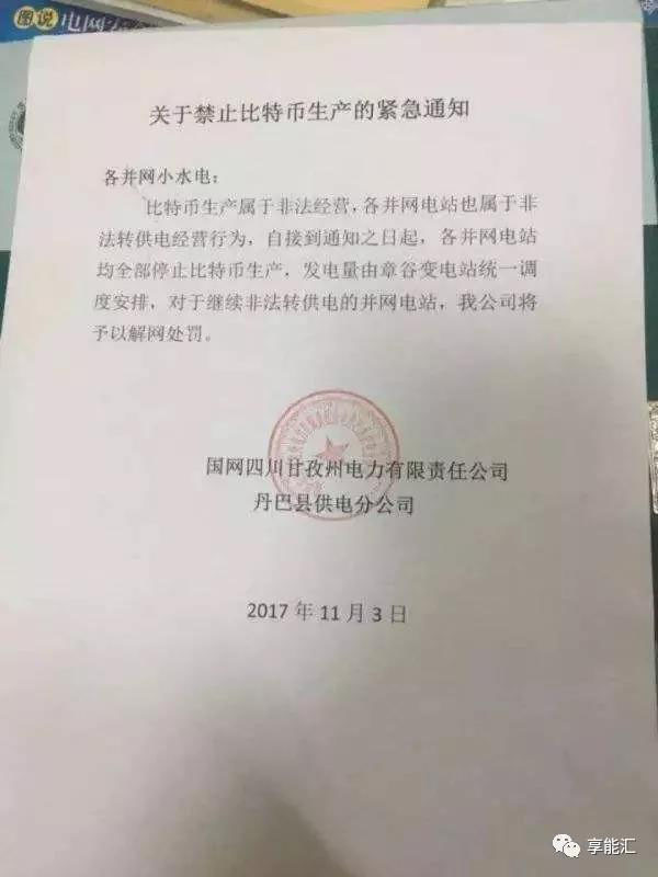 互聯(lián)網(wǎng)上流傳著一張2017年11月3日,落款為國(guó)網(wǎng)四川甘孜州電力有限責(zé)任公司丹巴縣供電分公司下發(fā)的《關(guān)于禁止比特幣生產(chǎn)的緊急通知》的文件,該文件要求各并網(wǎng)電站停止比特幣生產(chǎn),電量由變電站統(tǒng)一調(diào)度。這份文件隨后由國(guó)家電網(wǎng)四川省電力公司證實(shí)是丹巴縣供電分公司下發(fā)的通知,原因是當(dāng)?shù)剡M(jìn)入枯水期后,發(fā)電量已經(jīng)無(wú)法滿(mǎn)足民生需求,而有部分中小電站并沒(méi)有供電資質(zhì),卻還在給礦場(chǎng)發(fā)電,才緊急發(fā)布的這一通知。