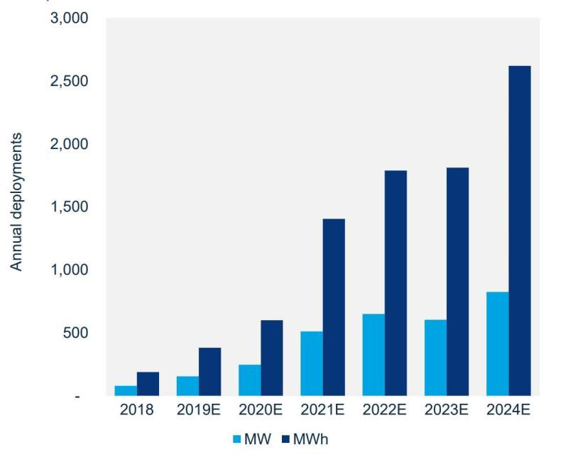 2018-2024年美國非住宅儲能部署的裝機(jī)容量和容量預(yù)測