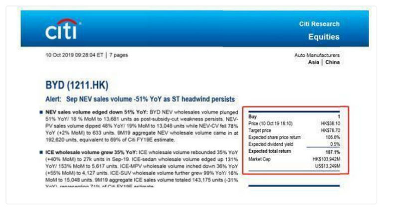 花旗、大和、瑞信銀行等眾多知名券商,均看好比亞迪長期發(fā)展?jié)摿Γl(fā)布多篇“買入/增持”的研究報告。