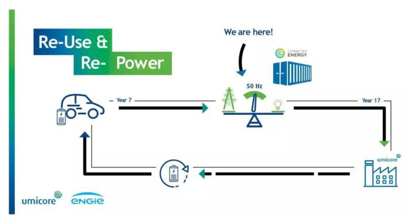 中國(guó)儲(chǔ)能網(wǎng)訊:法國(guó)能源服務(wù)公司ENGIE公司與電池回收公司Umicore公司合作,在比利時(shí)奧倫(Olen)的一個(gè)工業(yè)現(xiàn)場(chǎng)建成首個(gè)“第二次使用”電池儲(chǔ)能系統(tǒng)。該系統(tǒng)由48輛雷諾電動(dòng)汽車(chē)已經(jīng)使用7年的鋰電池組成,構(gòu)成了1.2 MW或720 kWh的大型蓄電系統(tǒng)。舊電池的原始儲(chǔ)能量為每塊電池22 kWh,在“第二次使用”應(yīng)用中,每塊電池仍然具有15-17 kWh儲(chǔ)能量,作為為電網(wǎng)服務(wù)的儲(chǔ)能電池仍可以使用10年。