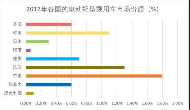 從全球電動車市場來看,中國電動車,特別是純電動車的銷量和保有量均遙遙領(lǐng)先。國際能源署發(fā)布的全球電動輕型乘用車保有量數(shù)據(jù)(圖1)顯示,中國純電動車保有量在2014年后加速顯著,2017年同比增長96.9%,占全球保有量的49.3%。中國電動輕型乘用車銷售市場份額2017年達1.8%,領(lǐng)先于美國、德國、日本等主要發(fā)達國家(圖2)。