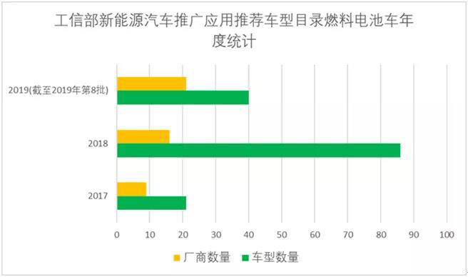 與此形成鮮明對比的是,燃料電池車在通知中被單獨對待,補貼并未一同調(diào)整,近期關(guān)注度頗高。多個地方政府出臺氫燃料電池車發(fā)展規(guī)劃,相關(guān)產(chǎn)業(yè)集聚效果逐漸顯現(xiàn)。而出現(xiàn)在工信部《新能源汽車推廣應(yīng)用推薦車型目錄》中的燃料電池車型號數(shù)量從2017年21款快速上升到2018年86款,2019年僅第6、第7和第8批就公示18個廠商的28款燃料電池車。