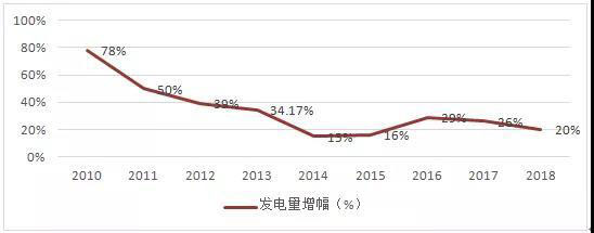 從2010年至2018年,我國風能發(fā)電量從497億千瓦時增至3660億千瓦時,平均年增幅為0.83倍。風能發(fā)電占比從1.2%增至5.2%,發(fā)電量增幅(比上年增長)則從78%降到了20%,盡管2016年出現(xiàn)了反彈,但整體發(fā)電量增幅呈下降趨勢。2019年上半年,全口徑并網(wǎng)風能發(fā)電量為2145億千瓦時,同比增長11.5%,增幅減弱趨勢明顯。