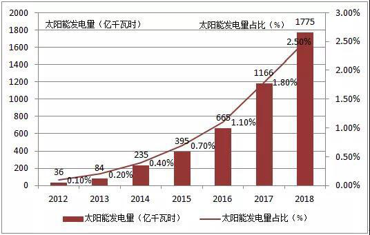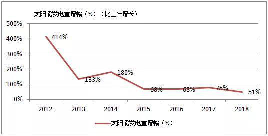 從2012-2018年,我國太陽能發(fā)電量從36億千瓦時增長至1775億千瓦時,平均每年增長高達8.3倍。太陽能發(fā)電量占比從0.1%到2.5%,占比逐漸加大。而發(fā)電量增幅(比上年增長)從414%降低到50%,總體呈現(xiàn)減弱態(tài)勢。2019年上半年,全口徑并網(wǎng)太陽能發(fā)電量為1063億千瓦時,同比增長29%,增幅減弱趨勢明顯。