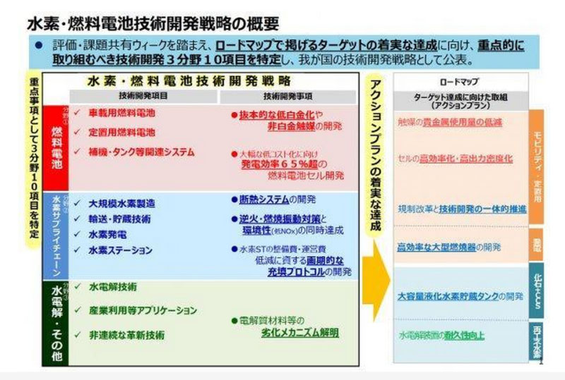 該戰(zhàn)略著眼于三大技術(shù)領(lǐng)域:燃料電池技術(shù)領(lǐng)域、氫供應(yīng)鏈領(lǐng)域和電解技術(shù)領(lǐng)域,確定了包括車載用燃料電池、定置用燃料電池、大規(guī)模制氫、水制氫等10個(gè)項(xiàng)目作為優(yōu)先領(lǐng)域,并通過互相合作來促進(jìn)技術(shù)的研究與開發(fā)。