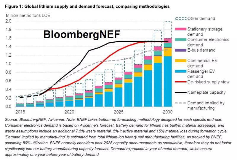 注:BNEF采用針對(duì)每種特定用途分別設(shè)計(jì)的自下而上的預(yù)測(cè)方法學(xué)。圖中,消費(fèi)電子產(chǎn)品的需求是基于Avicenne的預(yù)測(cè)。鋰電池的鋰需求已包含廢料率:在成型周期中,假設(shè)廢料包括廢棄材料7.5%、惰性材料5%和材料損失15%。假設(shè)制造利用率為80%,BNEF跟蹤鋰離子電池廠商的總產(chǎn)量,估算得出由產(chǎn)量倒推的需求。BNEF認(rèn)為計(jì)劃在2025年以后上線的產(chǎn)能公告具有投機(jī)性,因此這類公告對(duì)我們的電池制造產(chǎn)能預(yù)測(cè)影響不大。需求以金屬需求的年份表示,大約比電池需求早一年出現(xiàn)。