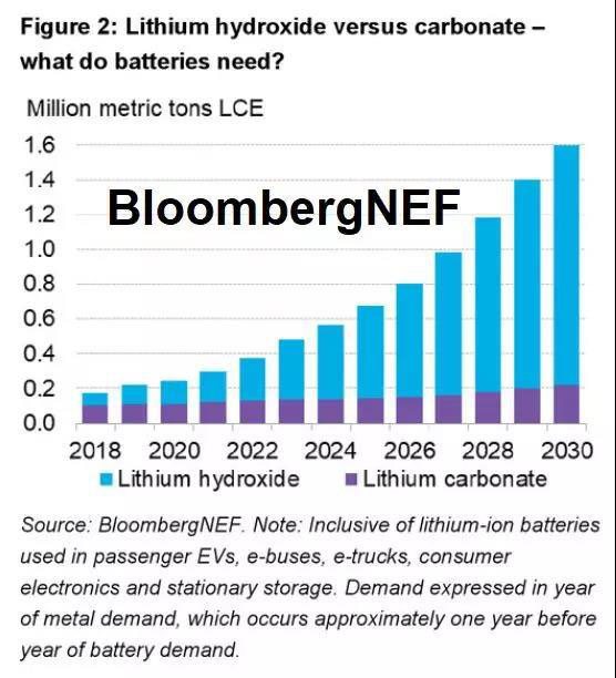 市場(chǎng)對(duì)鋰需求預(yù)測(cè)的差異,也在于各方對(duì)氫氧化鋰和碳酸鋰的比例看法不同。根據(jù)自下而上的預(yù)測(cè)方法,BNEF預(yù)測(cè)高鎳正極材料使用率將逐漸上升,特別是用于新能源乘用車的電池,促使氫氧化鋰的需求增長(zhǎng)快于碳酸鋰。到2030年,電池級(jí)氫氧化鋰的需求可能近140萬(wàn)噸LCE,而碳酸鋰的需求將達(dá)21.8萬(wàn)噸LCE。詳情請(qǐng)參考下圖。