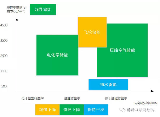 但電化學儲能和超導儲能成本都處于快速下降趨勢。其中電化學儲能近期成本下降較快。隨著電池成本下降速度加快,內(nèi)部收益率(IRR)將逐漸增加,經(jīng)濟性趨好。當電池成本下降速度足夠大時,電化學儲能項目有望超過基準收益率,從電力系統(tǒng)整體收益來看,其財務(wù)逐步具備可行性。