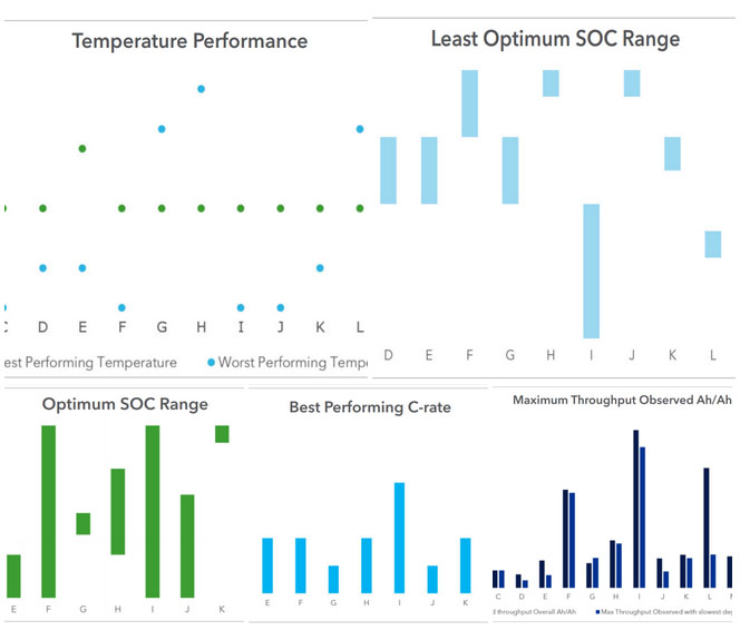 并按照上面的方式和原因進(jìn)行邏輯分析,研究小組研究了16種電池在四種基于鋰離子化學(xué)物質(zhì)電池的結(jié)果(下圖中5個圖表):鎳鈷錳酸鋰(NMC)、鎳鈷鋁酸鋰(NCA)、鈦酸鋰、磷酸鐵鋰(LiFePO4),以及一種專有化學(xué)成分的非鋰離子電池。對于每個測試的電池,研究小組研究了最佳和最差的溫度條件,最佳和最差的平均充電狀態(tài)(SOC)窗口,最佳電池充放電速率以及在這些條件或接近這些條件下測得的吞吐量。其目的是展示每種電池技術(shù)的應(yīng)用案例。
