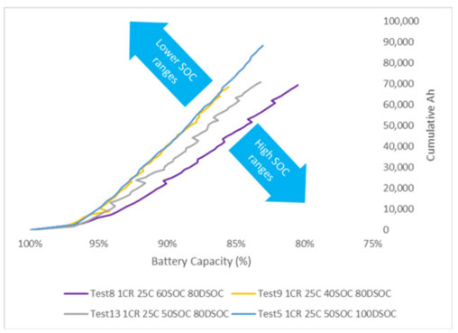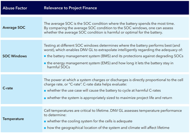 DNV GL公司的一個研究小組增加了測試電池產(chǎn)品的數(shù)量(16種電池),并增加了測試項目,以包括近500條單獨(dú)的電池測試曲線。DNV GL的電池產(chǎn)品合格計劃(PQP)測試了電池的四種“濫用因素”:平均充電狀態(tài)(SOC)、平均充電狀態(tài)(SOC)波動(或窗口)、電池充放電速率(C速率)和溫度。其邏輯是這四個變量主要決定電池的退化行為,并且了解它們對退化的影響,用戶可以在項目財務(wù)模型中獲得有關(guān)更換電池時間間隔的信息,從而了解電池更換成本。
