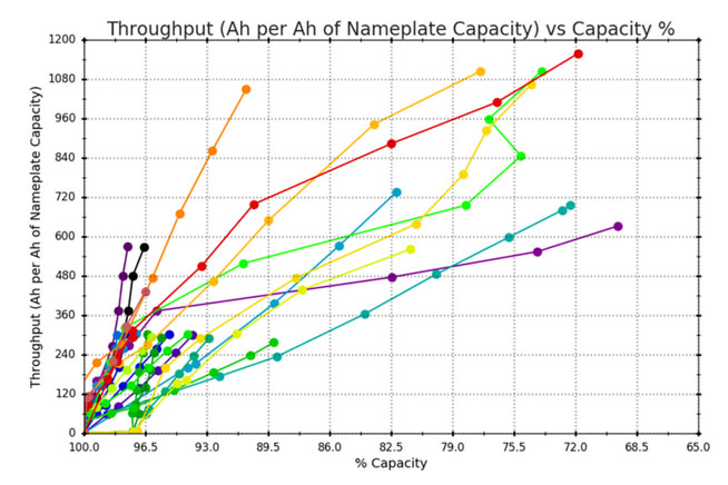 DNV GL還希望引入一個新術(shù)語,以便在考慮電池工作壽命時考慮與“循環(huán)”相對應(yīng)的情況,即“吞吐量”(有時是“周轉(zhuǎn)率”),它實際上是考察流經(jīng)電池的總電量。例如,研究隨著容量退化,電池每個充放電周期輸送的總能量將如何變化。如下圖所示。