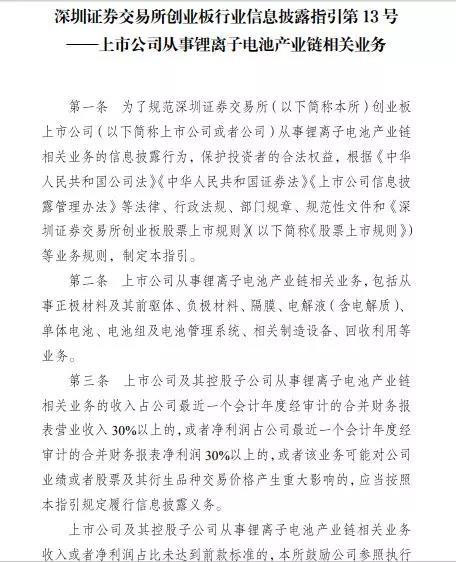 11月3日,深交所為規(guī)范創(chuàng)業(yè)板上市公司從事鋰離子電池產(chǎn)業(yè)鏈相關(guān)業(yè)務(wù)的信息披露行為,保護(hù)投資者的合法權(quán)益,發(fā)布了《深圳證券交易所創(chuàng)業(yè)板行業(yè)信息披露指引第13號——上市公司從事鋰離子電池產(chǎn)業(yè)鏈相關(guān)業(yè)務(wù)通知》(以下簡稱“《通知》”)。