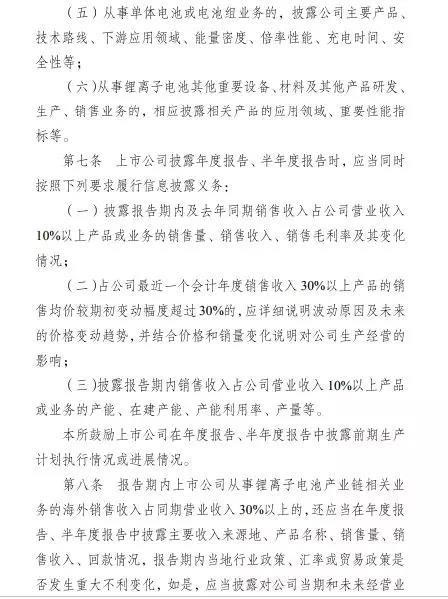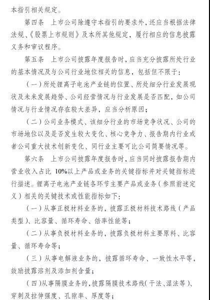 《通知》主要圍繞相關(guān)公司充分披露行業(yè)情況、公司市場地位、主要產(chǎn)品及業(yè)務(wù)的關(guān)鍵技術(shù)或性能指標(biāo)等對上市公司進(jìn)行了要求。披露業(yè)務(wù)涉及正極材料及其前驅(qū)體、負(fù)極材料、隔膜、電解液(含電解質(zhì))、單體電池、電池組及電池管理系統(tǒng)、相關(guān)制造設(shè)備、回收利用等。
