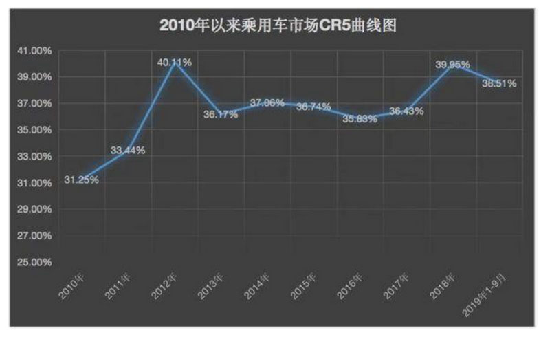 經(jīng)濟觀察報記者統(tǒng)計了從2010年至2019年9月的乘用車前五名企業(yè)的市場集中度(簡稱CR5)。整體來看,汽車行業(yè)集中度在過去十年走過了一條頗為曲折的路線。
