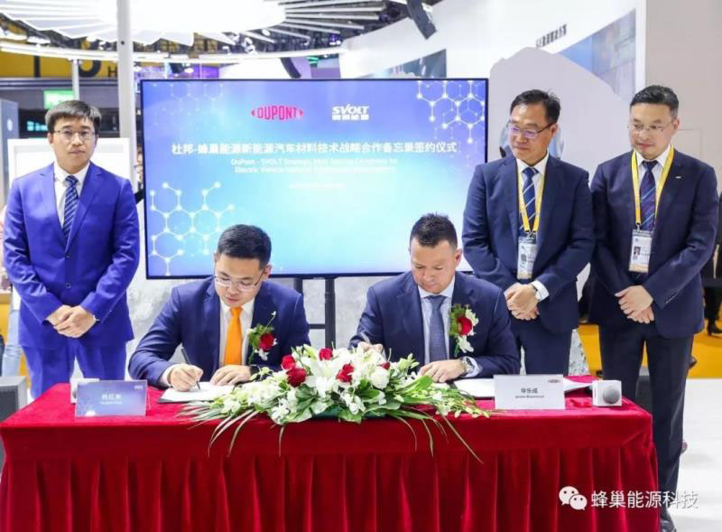 2019年11月7日上午,蜂巢能源科技有限公司與杜邦交通運輸和工業(yè)部門在上海第二屆中國國際進口博覽會現(xiàn)場舉行戰(zhàn)略合作簽約儀式,宣布雙方將合作探索新技術(shù)在新能源行業(yè)的應(yīng)用。蜂巢能源總經(jīng)理楊紅新、杜邦交通與工業(yè)事業(yè)部高性能材料全球副總裁畢樂成(JeroenBloemhard)代表雙方簽署了合作協(xié)議。
