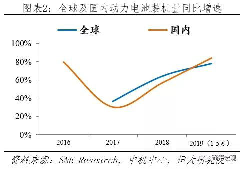 受益新能源汽車產(chǎn)銷規(guī)模擴大及單車帶電量提升,動力電池市場保持高速增長。據(jù)中機中心合格證數(shù)據(jù)統(tǒng)計,2009-2018年期間,我國動力電池裝機量從0.028GWh增加到57.04GWh,十年增長超千倍,年復合增速達233.17%。據(jù)SNE Research和中機中心統(tǒng)計,2019年1-5月全球市場動力電池裝機量為41.76GWh,同比增長78.00%;國內(nèi)市場動力電池裝機量為23.37GWh,同比增長83.94%。