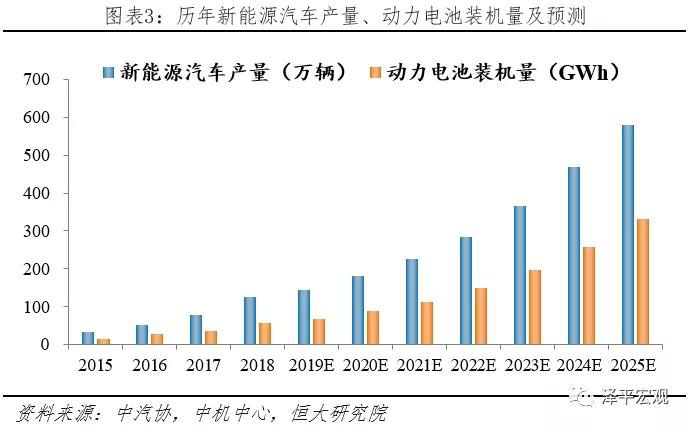 行業(yè)仍有很大發(fā)展空間。按照2025年新能源汽車產(chǎn)量590萬輛測算,動力電池需求量將達到330.6GWh,相比2018年57.07GWh,對應年復合增速為28.52%。