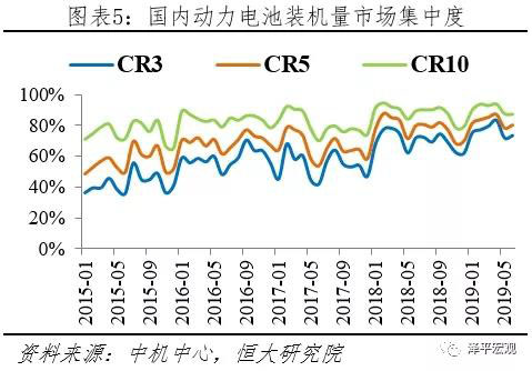 下游新能源汽車由導入期邁入成長期、補貼退坡、技術(shù)性能要求提升等因素加劇了電池行業(yè)優(yōu)勝劣汰,市場集中度提升。據(jù)中汽中心統(tǒng)計,按照集團口徑,2018年我國新能源汽車動力電池配套企業(yè)數(shù)量只有93家,相比2015年240家減少近2/3。據(jù)合格證數(shù)據(jù)統(tǒng)計,國內(nèi)動力電池市場CR3、CR5、CR10份額自2015年起持續(xù)提升,2019年7月市場CR3、CR5、CR10分別占比84%、89%、94%,相比2015年1月36%、48%、71%分別提升48、41、23個百分點。