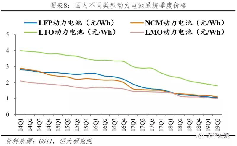 在競爭加劇、補貼退坡、規(guī)模效應等因素共同作用下,電池價格快速下降,部分已接近1元/Wh。目前國內(nèi)動力電池系統(tǒng)按照材料體系劃分主要有磷酸鐵鋰(LFP,正極材料)、三元鎳鈷錳(NCM,正極材料)、鈦酸鋰(LTO,負極材料)、錳酸鋰(LMO,正極材料)四種。據(jù)統(tǒng)計,2014年第一季度LFP、NCM、LTO、LMO動力電池Pack售價分別為2.80、2.90、4.00、2.10元/Wh,截止到2019年第二季度售價分別下降到1.05、1.10、1.80、1.00元/Wh,對應下降幅度62.5%、62.0%、55.0%、52.4%。