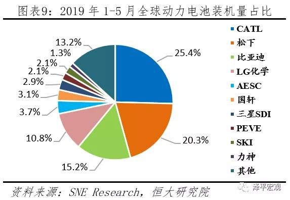 全球市場中本土動力電池廠商市場份額占比過半。據(jù)SNEResearch披露,2019年1-5月全球動力電池裝機量TOP10企業(yè)分別為:CATL、松下、比亞迪、LG化學、AESC、國軒高科、三星SDI、PEVE、SKI、力神;前十名本土廠商占有五席,合計占據(jù)48.6%的市場份額,前五名本土廠商占有三席,CATL以25.4%市占率位列全球第一。