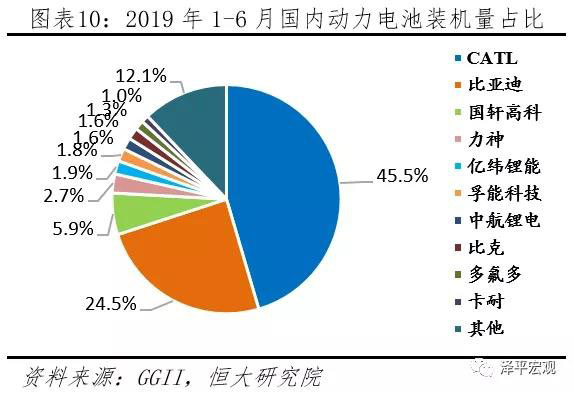 國內(nèi)市場中本土廠商占據(jù)絕大多數(shù)市場份額。由于財政補貼、動力電池白名單等限制,外資在國內(nèi)裝機量很低。據(jù)GGII統(tǒng)計,2019年上半年國內(nèi)動力電池裝機量TOP10企業(yè)分別為CATL、比亞迪、國軒高科、力神、億緯鋰能、中航鋰電、比克、多氟多和卡耐,皆為本土廠商,合計占據(jù)87.9%的市場份額。
