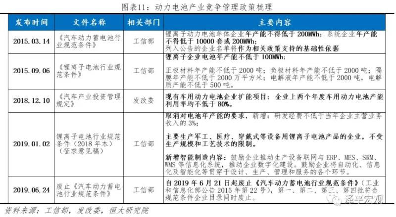 2)第二階段為鼓勵企業(yè)做強。2018年12月發(fā)改委發(fā)布《汽車產(chǎn)業(yè)投資管理規(guī)定》要求,只有上兩個年度車用動力電池產(chǎn)能利用率均不低于80%的動力電池企業(yè)才能擴產(chǎn)。2019年1月工信部發(fā)布《鋰離子電池行業(yè)規(guī)范條件(2018年本)(征求意見稿)》,取消對企業(yè)產(chǎn)能要求,鼓勵企業(yè)制造數(shù)字化、智能化。此外,2019年工信部發(fā)布《廢止《汽車動力蓄電池行業(yè)規(guī)范條件》公告,動力電池白名單自2019年6月21日取消。