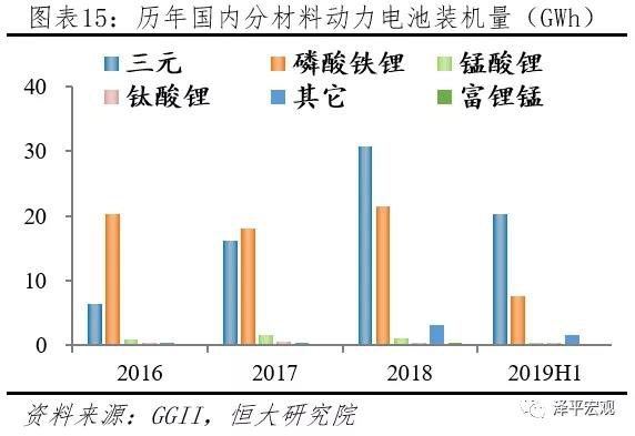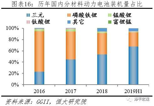 由于動力電池財政補貼能量密度門檻提升及消費者對高續(xù)航新能源汽車的青睞,三元材料電池裝機量占比持續(xù)提升。據(jù)GGII披露,2019年上半年三元體系動力電池裝機量為20.22GWh,市占率達67.35%,較2016年提升44.46個百分點。