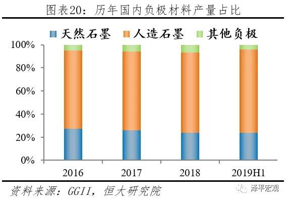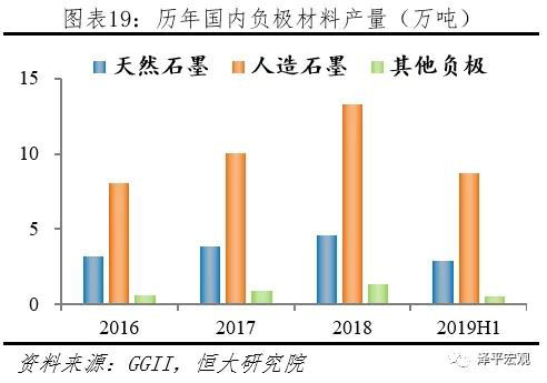 當前負極材料應用以人造石墨為主、天然石墨為輔。據(jù)GGII統(tǒng)計,2019上半年我國人造石墨、天然石墨、其他負極產(chǎn)量分別為87500、28800、5000噸,對應占比72.14%、23.74%、4.12%,人造石墨占比超過7成。從趨勢上看,人造石墨市場占比緩慢提升,從2016年到2019H1增加4.29個百分點。
