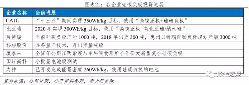 碳負極有望成為下一代負極材料。商用化石墨負極實際容量已接近理論值372mAh/g,提升空間有限,急需尋找新的替代材料。Si單質(zhì)由于充電過程中體積膨脹大(接近300%,石墨10%),首次充電效率低、材料加工成本高、導電率差等缺點,無法單獨作為負極,但是其超高的理論容量(4200mAh/g)可成為理想的添加劑,碳負極中加入少量Si(5-10%)可顯著提升容量,硅碳負極有望成為下一代負極材料,各企業(yè)紛紛布局。國外松下硅碳負極技術(shù)領先,在2013年即實現(xiàn)量產(chǎn)(NCR18650),特斯拉Model 3用動力電池即采用硅碳負極。