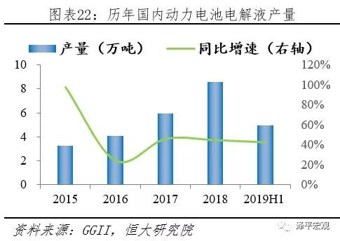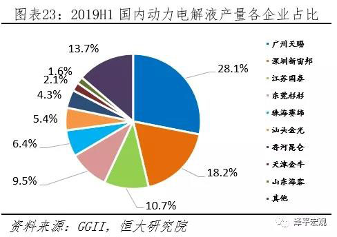 在新能源汽車產(chǎn)業(yè)帶動下,動力電池電解液行業(yè)保持高速增長。電解液號稱鋰離子電池的“血液”,導通電池正負極,對鋰離子電池的工作溫度、循環(huán)效率、安全性能、倍率性能等影響重大。據(jù)GGII披露,國內(nèi)動力電池電解液產(chǎn)量從2015年3.26萬噸,增長到2018年8.59萬噸,年復合增長率38.12%。2019上半年國內(nèi)動力電池電解液產(chǎn)量4.95萬噸,同比增長42.67%;前9名市場份額穩(wěn)定,由高到低分別是廣州天賜、深圳新宙邦、江蘇國泰華榮、東莞杉杉、珠海賽緯、汕頭金光、香河昆侖、天津金牛、山東海容;前三名合計占比57%,超過一半。