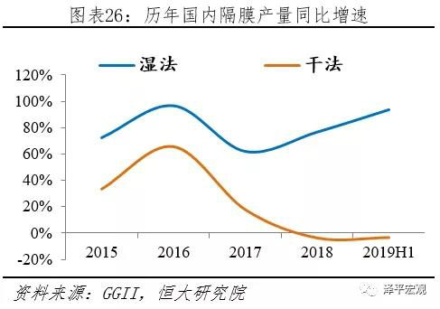 濕法隔膜是當前主流,占比逐年提升。據(jù)GGII披露,2019上半年我國隔膜總產(chǎn)量11.5萬噸,其中濕法、干法分別生產(chǎn)8.39、3.11萬噸,同比增速93.54%、-3.74%。從趨勢上看,濕法隔膜市場占比逐年提升,從2015年38.05%增加到2019上半年72.96%。在動力電池領域,濕法隔膜在性能和安全性上有著超越干法的顯著優(yōu)勢,更能夠適應當前動力電池高能量密度化發(fā)展趨勢。