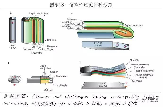 鋰離子電池按照封裝形態(tài)可分為圓柱、扣式、方形、軟包四種,其中扣式基本只在實驗室測試使用。