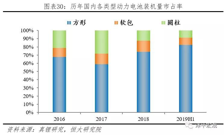 方形動力電池是當前市場主力,占比超過八成。據(jù)真鋰研究統(tǒng)計,2019年上半年國內(nèi)動力電池裝機量29.80GWh,其中方形、軟包、圓柱動力電池裝機量分別為24.56、2.60、2.65GWh,對應占比82.4%、8.7%、8.9%。從趨勢上看,方形占比持續(xù)提升,從2016年67.60%提升到2019H1的82.4%。因沃特瑪“爆雷”,圓柱占比在2017年之后急劇縮小。