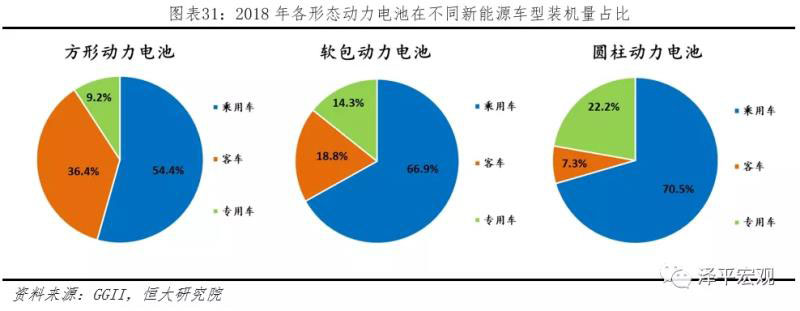 方形、軟包、圓柱在不同車型上占比差異較大。據(jù)GGII統(tǒng)計2018年三種形態(tài)動力電池在乘用車、客車、專用車的裝機量占比,其中方形分別為54.4%、36.4%、9.2%,圓柱為70.5%、7.3%、22.2%,軟包為66.9%、18.8%、14.3%。對比發(fā)現(xiàn):1)方形動力電池在專用車上的占比較低,主要是由于方形電池龍頭CATL的客戶基本都是乘用車和客車企業(yè);2)圓柱動力電池在客車上占比較低,一方面是由于客車電池組能量200-300KWh(乘用車40-60KWh),而圓柱電芯單體能量較小,如果使用圓柱電池,需要的電池單體數(shù)量太大、難以管理,另一方面是由于國內(nèi)圓柱動力電池主要采用三元材料,價格昂貴,用于客車上不經(jīng)濟。