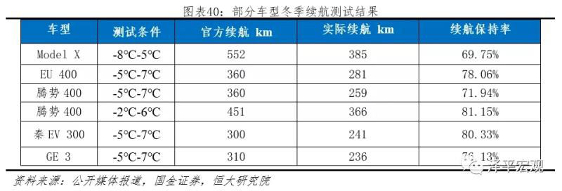 低溫不僅降低材料的反應活性,而且會造成電解液凝固、離子遷移率降低、極化電壓增大等。應用到動力電池,低溫就會造成:1)放電容量降低(部分Li+來不及反應);2)倍率性能下降(電解液接近凝固,離子遷移率下降);3)放電平臺降低(電池阻抗增加,極化電壓增大)。根據(jù)部分代表車型冬季續(xù)航測試結(jié)果可以發(fā)現(xiàn),在0℃左右的情況下,電動車續(xù)航會下降20-30%左右。