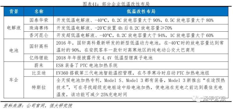 各企業(yè)布局低溫改性技術(shù),改善電動車冬季續(xù)航。電解液廠國泰華榮針對性開發(fā)低溫電解液,公司搭載該款電解液電池產(chǎn)品,-40°C、0.2C放電容量大于90%,0.5C放電容量大于80%。電池廠國軒高科,針對高寒低區(qū)開發(fā)的低溫動力電池,-40℃放電容量可達到常溫90%。整車廠蔚來、比亞迪等在其最新車型均搭載智能溫控系統(tǒng),在低溫下啟動PTC加熱電池組。