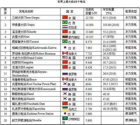 在世界上前20位發(fā)電站中,中國(guó)水力發(fā)電占有5席,均為水力發(fā)電。世界上最大的20座發(fā)電站每年都有變動(dòng),加拿大羅伯特-布拉薩大壩從原有的第17位沖到第7位;韓國(guó)古里核電站發(fā)展壓水反應(yīng)堆也沖入第13位,超過(guò)本國(guó)的韓蔚核電站和韓光核電站。