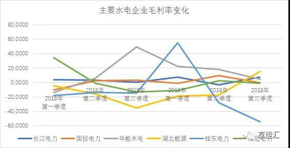 2019年前三季度水電公司長(zhǎng)江電力發(fā)電量增速為-2%、華能水電發(fā)電量增速為36%、桂冠電力發(fā)電量增速為-2%、 國(guó)投電力發(fā)電量增長(zhǎng)為8%。受季節(jié)水量變化影響,長(zhǎng)江電力、華能水電、國(guó)投電力發(fā)電量增速均較前一季度有所下滑。受水量的影響,可以看到前幾大企業(yè)毛利率同比變化明顯。