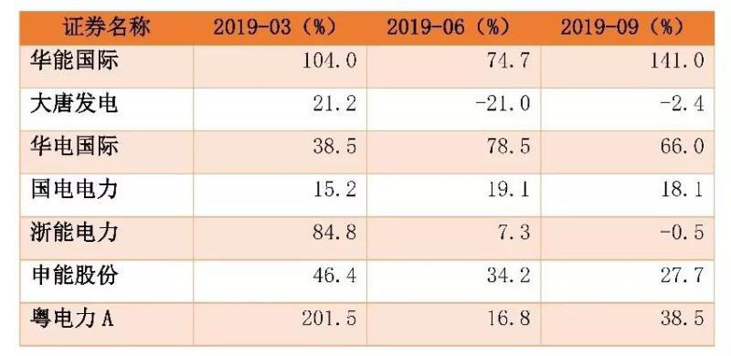 2019 年前三季度華能?chē)?guó)際、華電國(guó)際、國(guó)電電力、大唐發(fā)電收入增速在0-10%,凈利潤(rùn)除大唐發(fā)電之外前三季度均保持較高增長(zhǎng)。收入增速的變化主要是受到電價(jià)同比提升和發(fā)電量增速回升的影響。